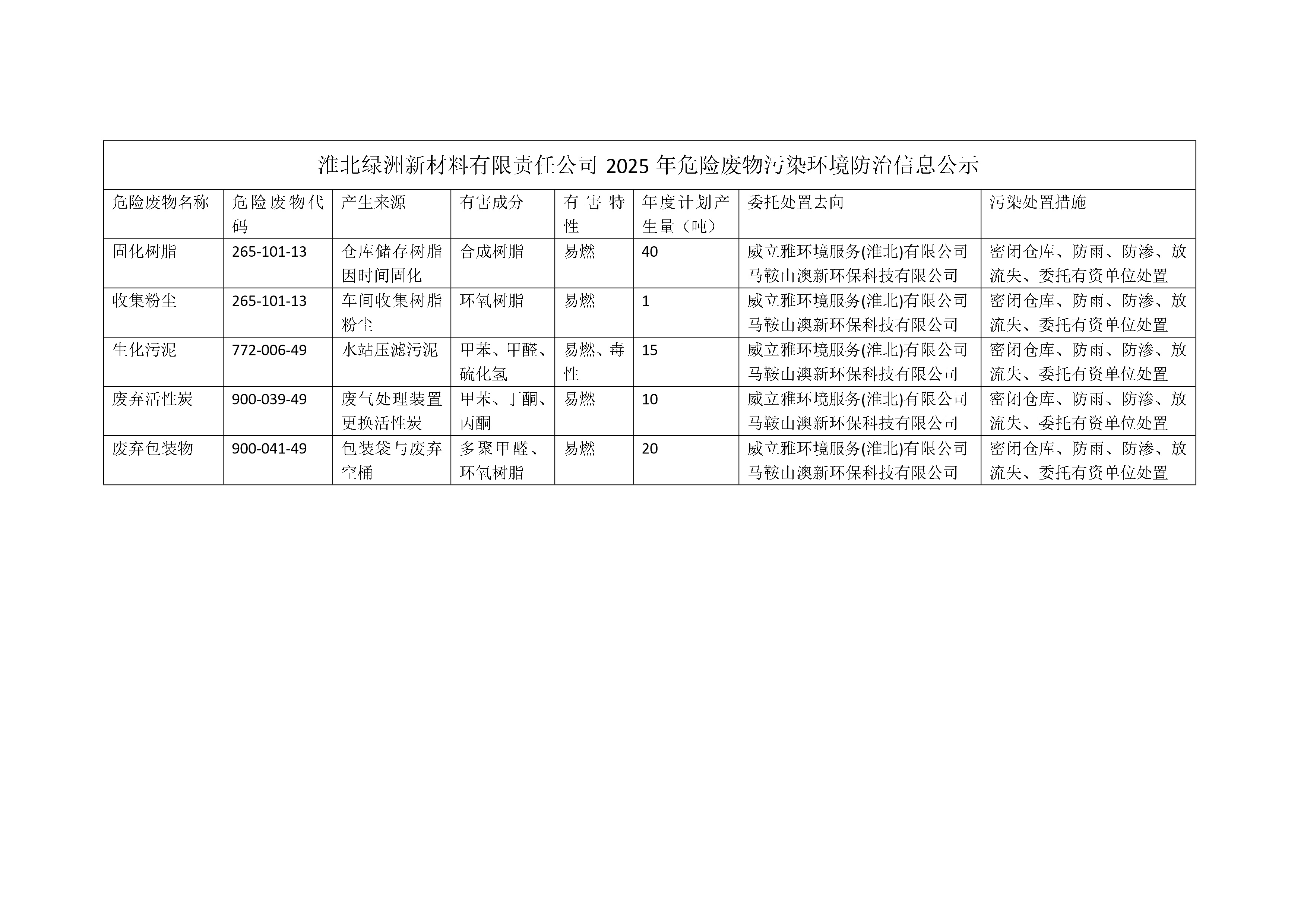 淮北綠洲新材料有限責(zé)任公司2025年危險(xiǎn)廢物污染環(huán)境防治信息公示